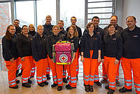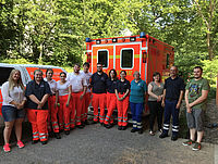 Die Prüflinge in ihren roten Einsatzhosen vor dem Simolations-Rettungswagen mit Prüfungskommission und Darstellern. Von links: Julia Seele, Julia Langhorst, Kimberly Nölting, Merve Inal, Tim Krämer…